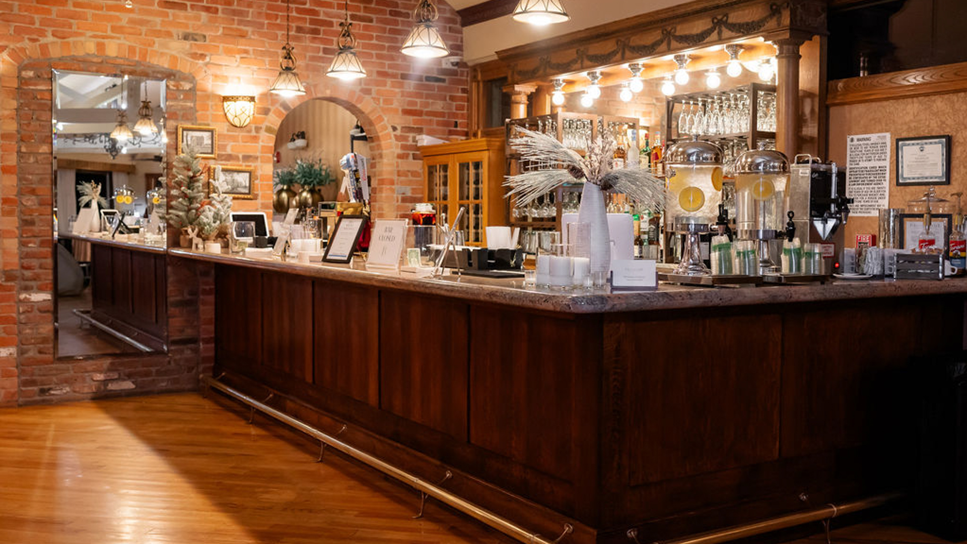 During your event, capture memorable photos throughout the three-acre grounds. Wander through vine-covered arbors and serene aspen groves, pause by the quaint waterfall feature surrounded by seasonal gardens, or take iconic shots against the historic 1889 brick farmhouse with its distinctive Victorian-era craftsmanship. Your guests can enjoy the Garden Pavilion for cocktail hour or receptions. This showstopping space features exposed brick walls, wooden beams, and romantic lighting with sparkling chandeliers and twinkling string lights. Large doors open to the gardens, creating a seamless indoor-outdoor flow while the moody décor and ambient illumination create an elegant celebration atmosphere.