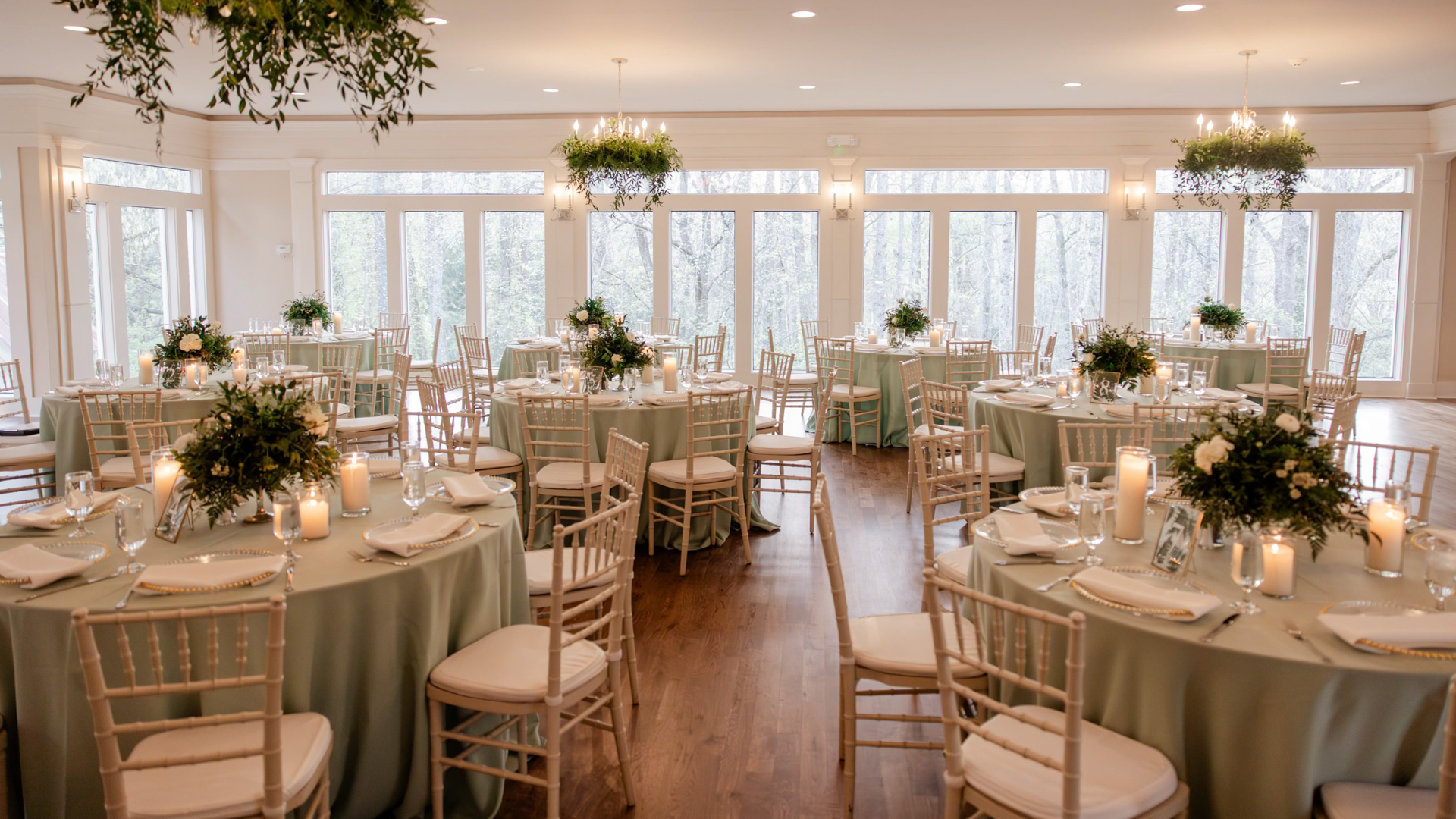 A glass-encased ballroom with woodland views fills the space with natural light and serene surroundings.