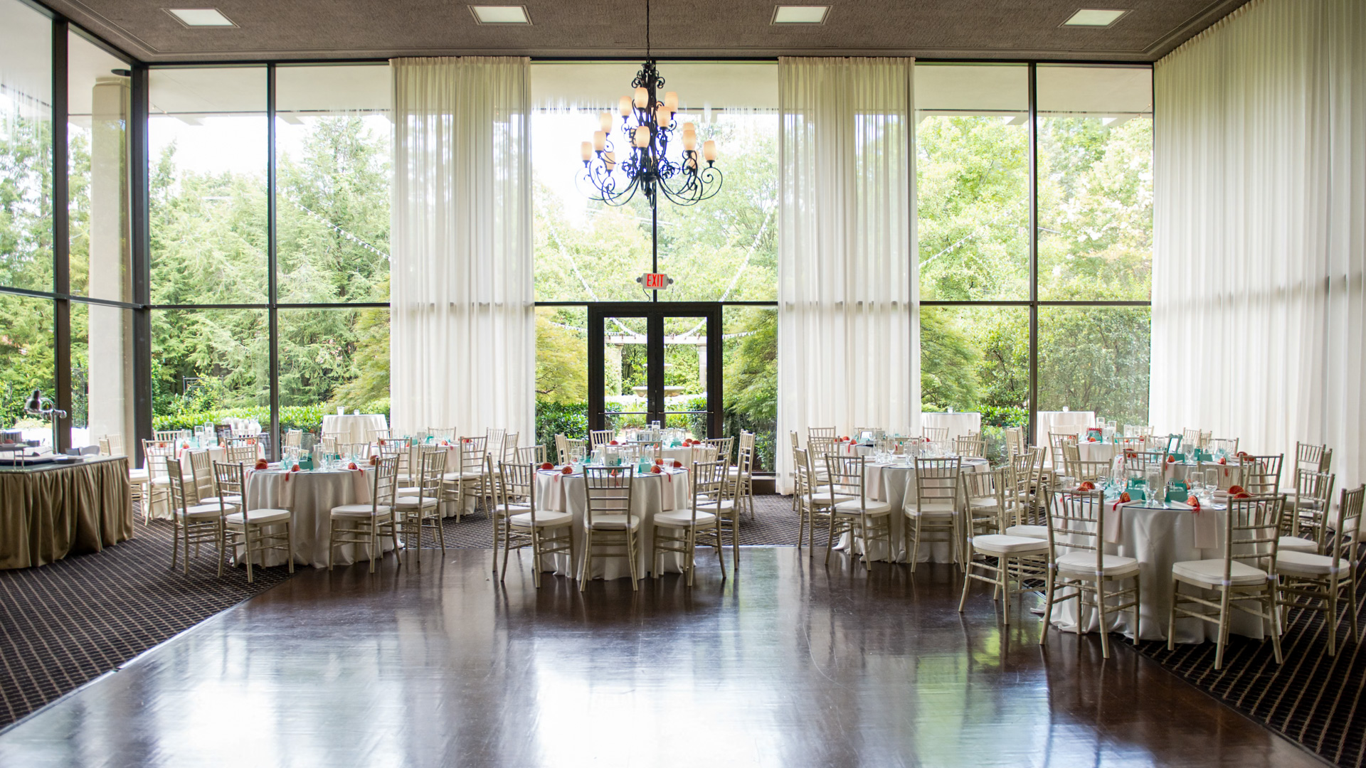 Inside, expansive two-story windows frame the surrounding gardens and fill the main event space with natural light, complemented by a spacious dance floor, sleek built-in bar, and clean, modern design that allows for flexible layouts and customized styling.