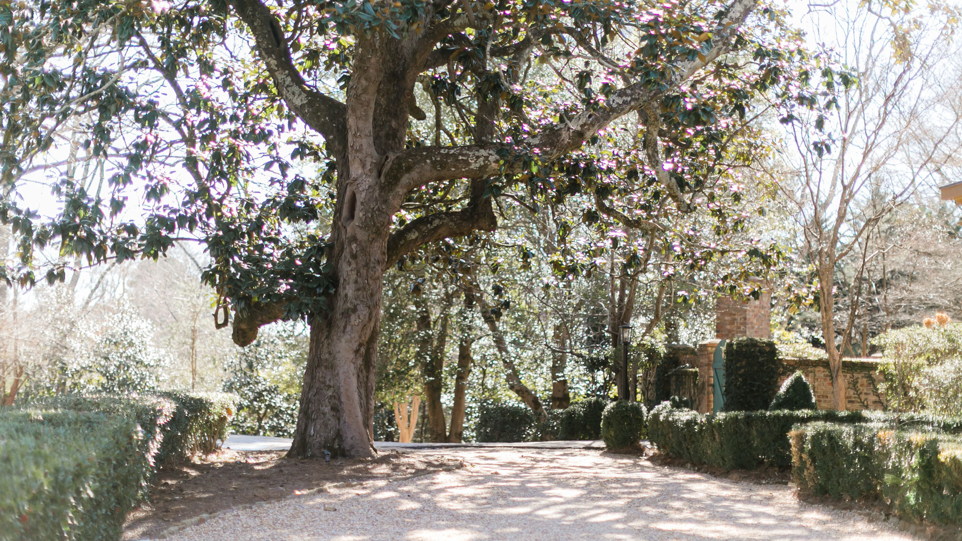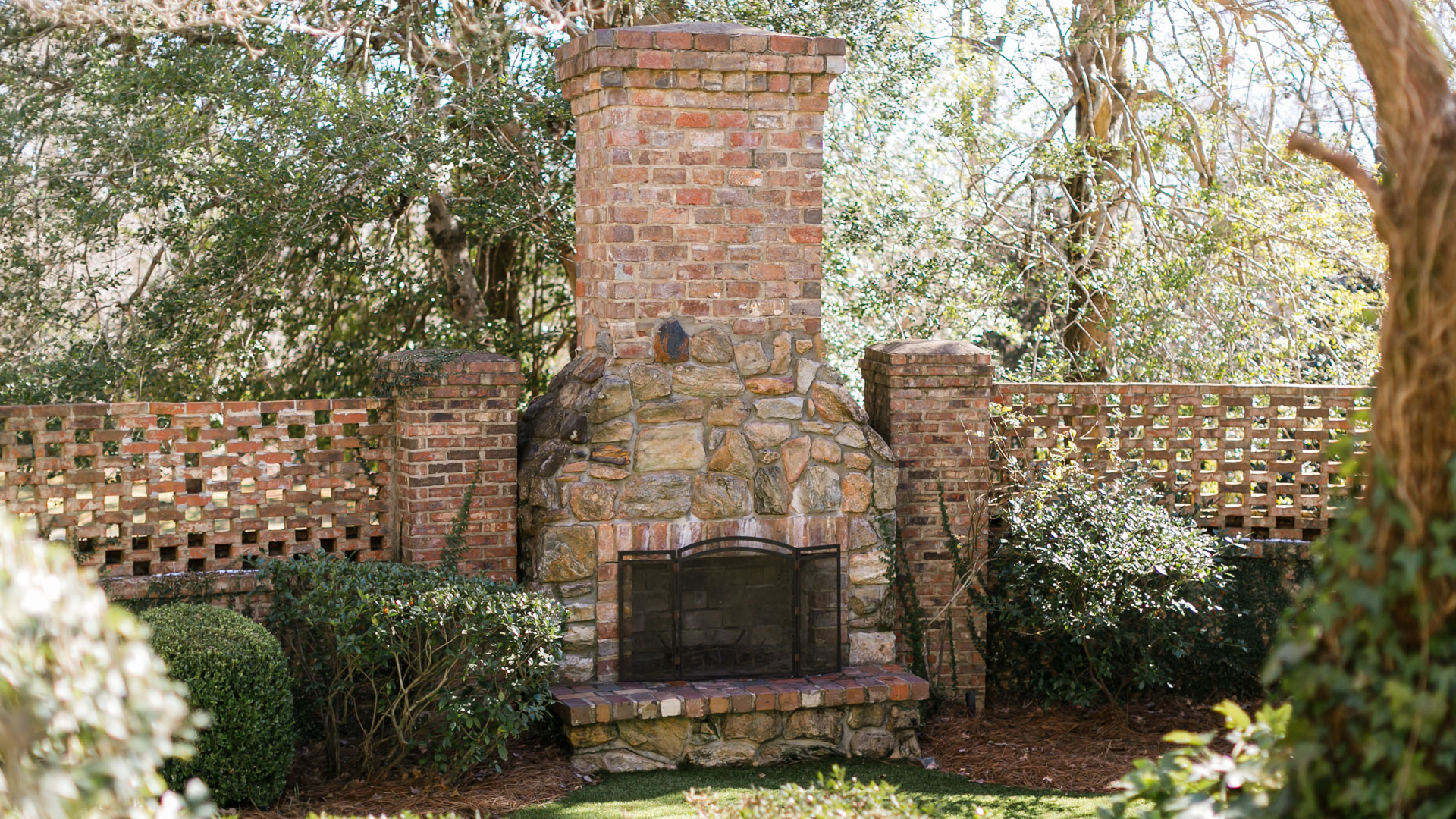For events that call for a more organic atmosphere, the tree-lined grounds offer open skies, mature landscaping, and flexible layouts that allow for customized setups, while guests arrive along a stone pathway framed by peaked cedar arches, creating an inviting first impression.