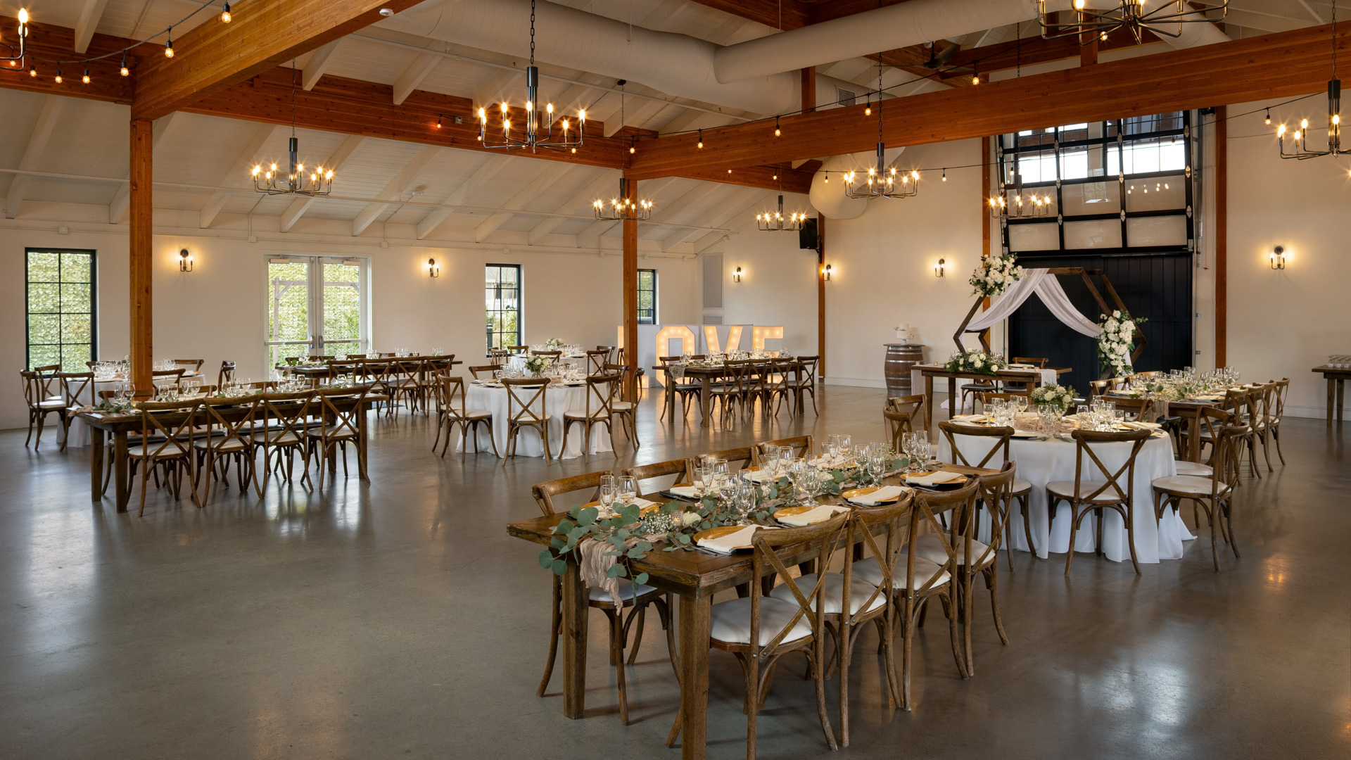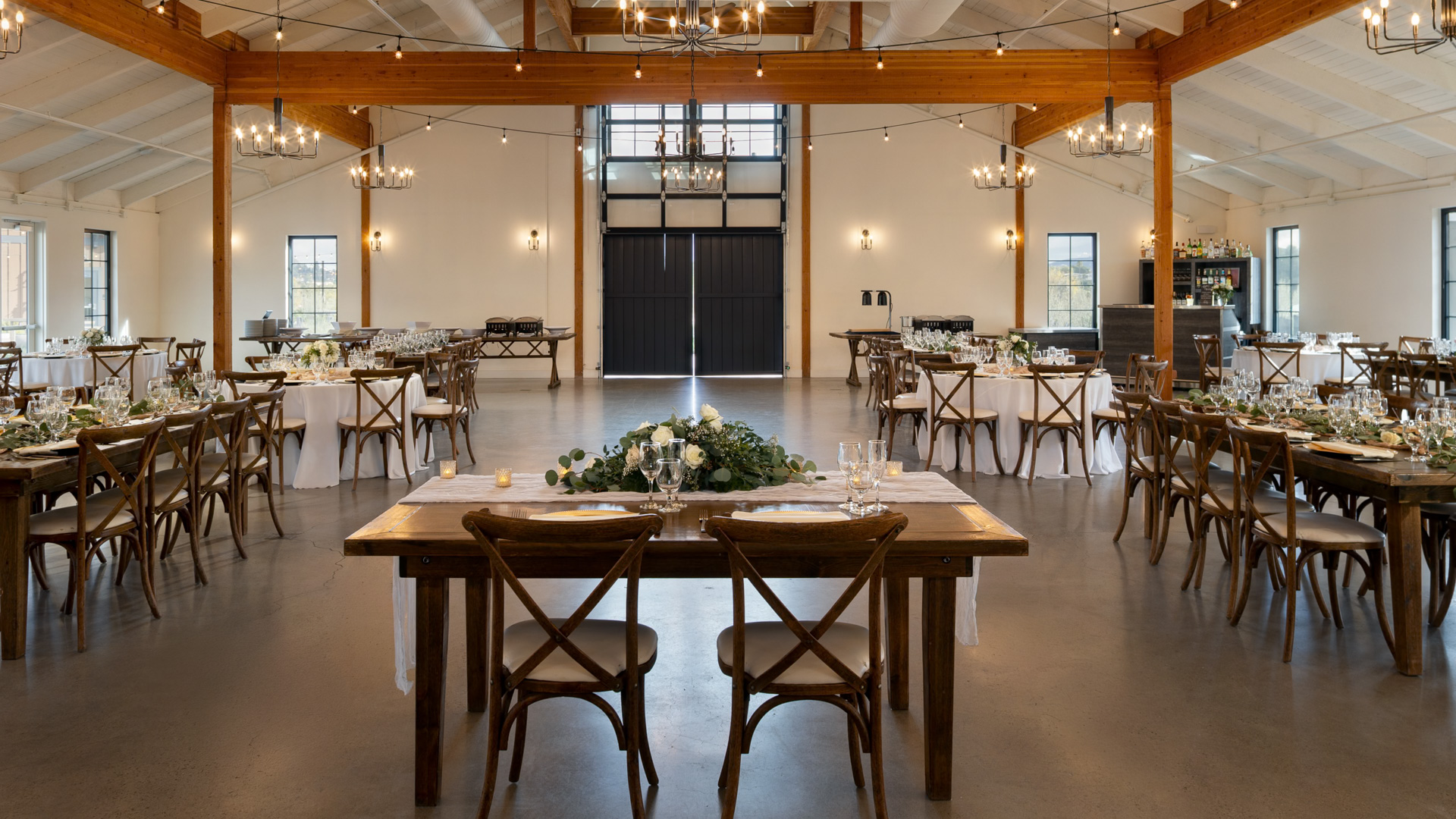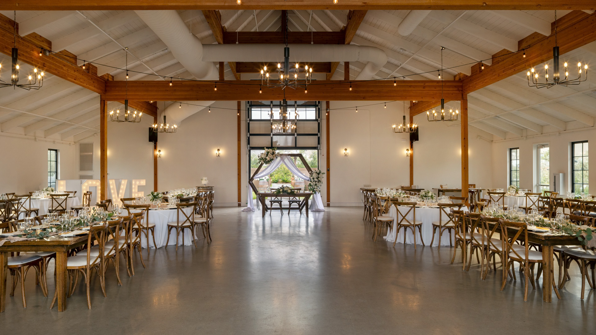 - Barn-styled gathering hall with exposed wood beams and large windows that fill the space with natural light