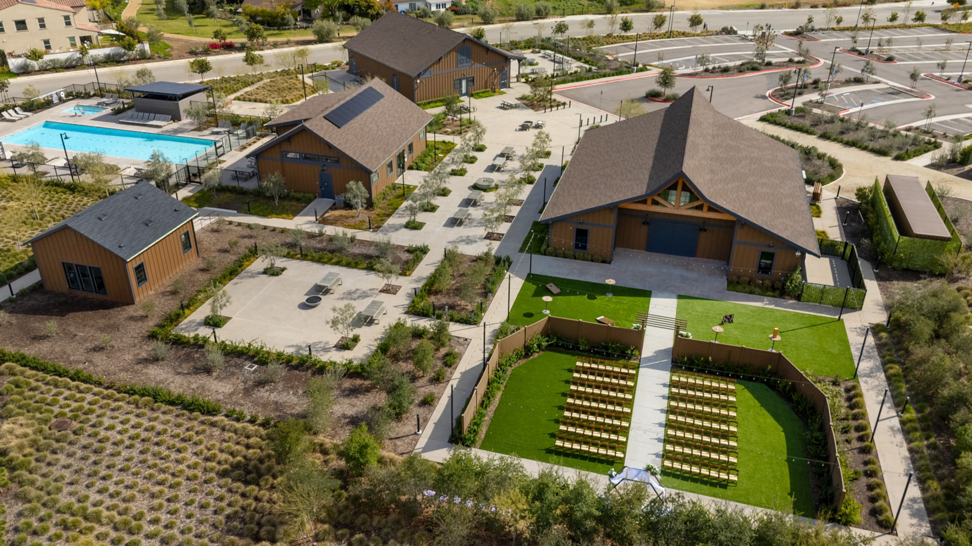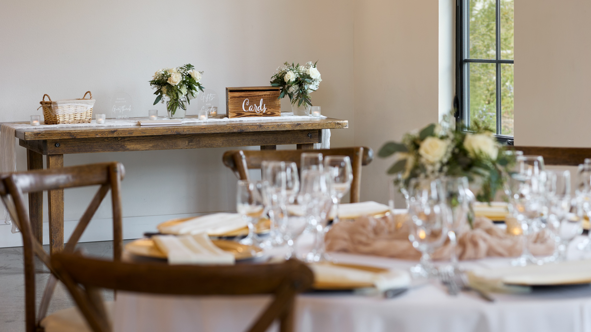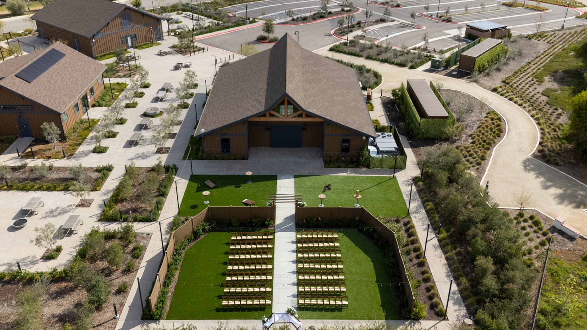 - Barn-styled gathering hall with exposed wood beams and large windows that fill the space with natural light