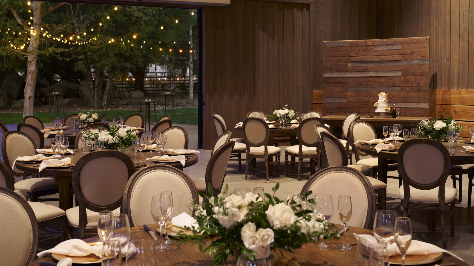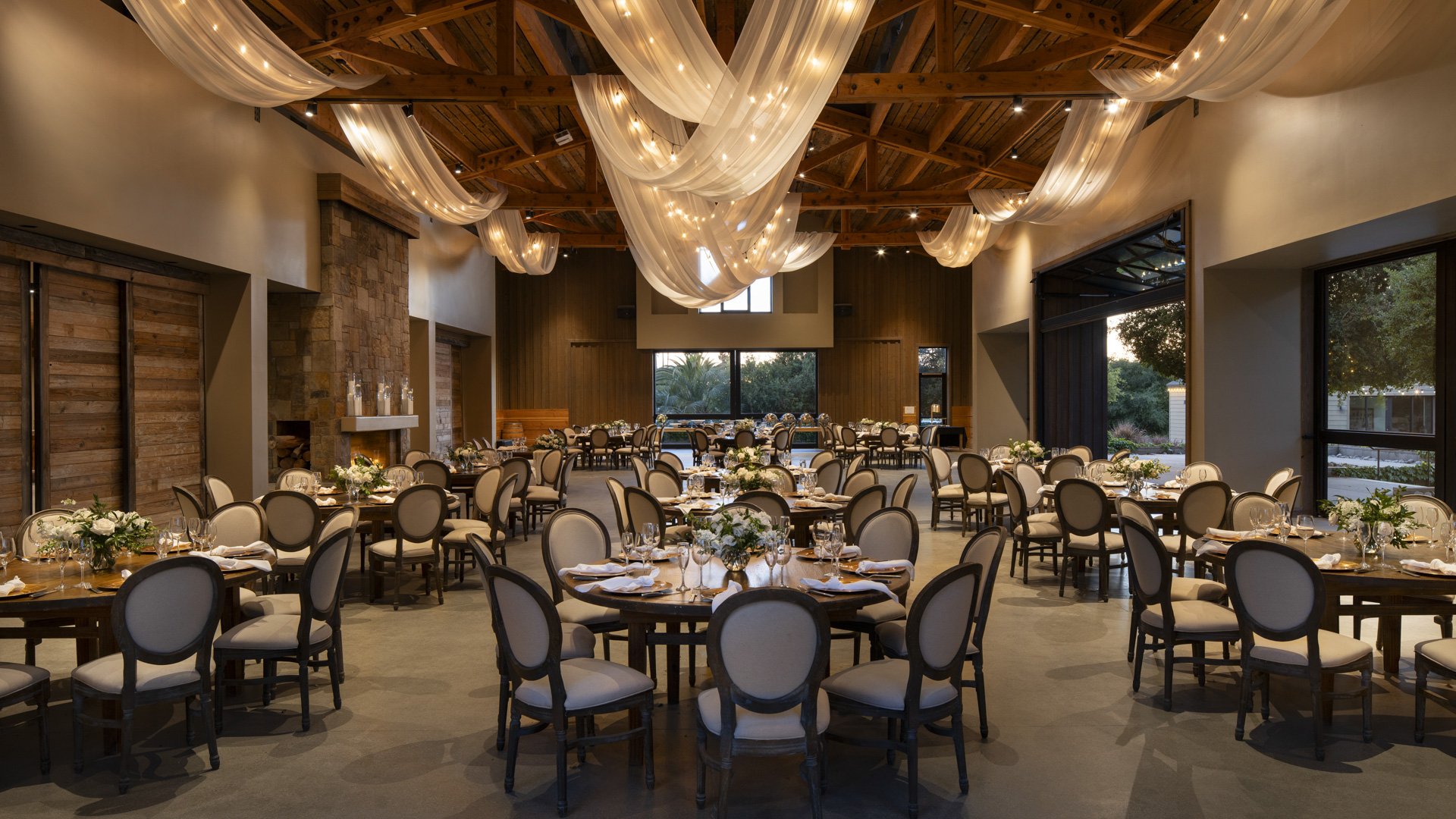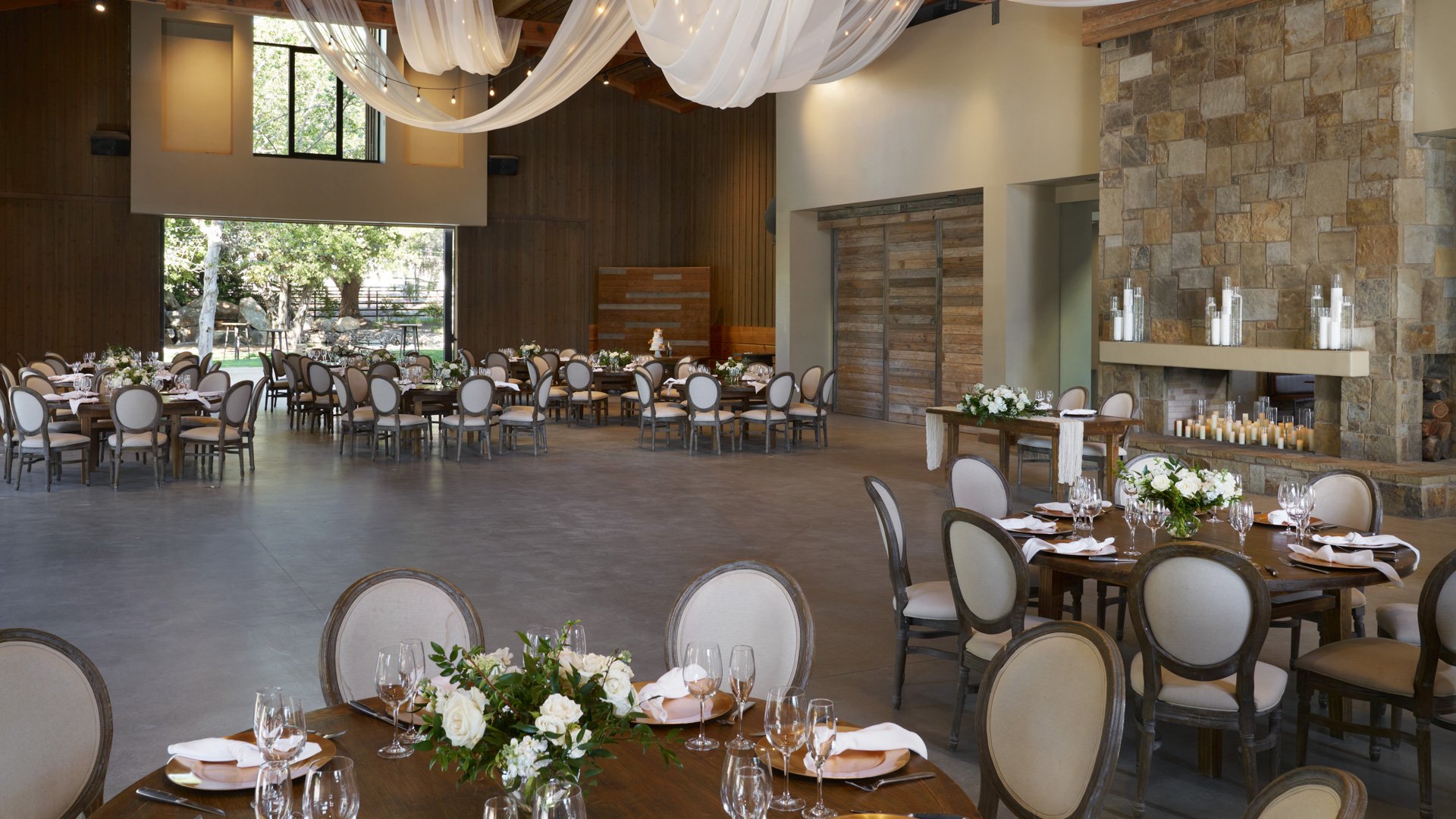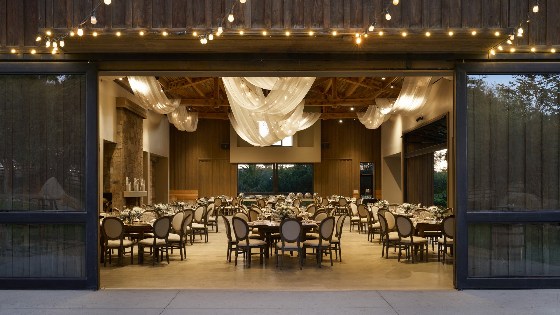 Enjoy a luxe reception in the modernized barn we call the "Carriage House," featuring a stately built-in bar, double-sided fireplace, and expansive garage doors that open to the outdoors, seamlessly blending the interior with the beauty of nature surrounding it. The Carriage House boasts beautiful draping with bistro lighting and oversized windows that allow for ample natural light. The space exudes a rustic yet elegant atmosphere with its polished concrete floors, exquisite stonework, and woodwork. With plenty of space for dancing, this versatile Temecula event center boasts a range of indoor and outdoor event areas for every type of gathering. Your guests will be completely wowed, wondering how you pulled it off - but you'll know how easy it really was.